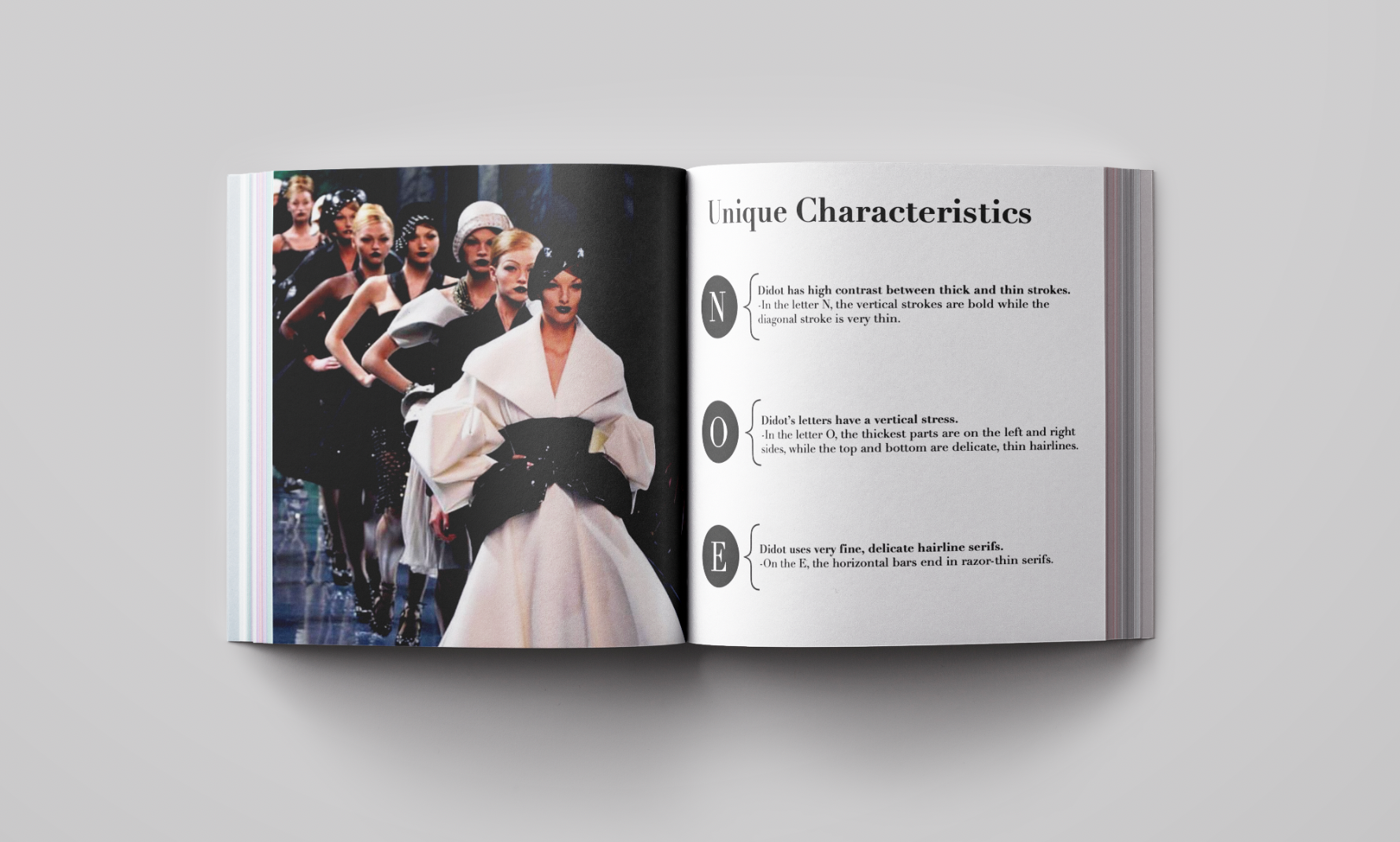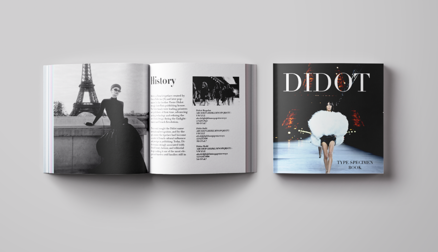 This is a type specimen book I designed in Adobe InDesign showcasing the Didot typeface. I paired it with a French high fashion theme to reflect the typeface’s elegant French roots.